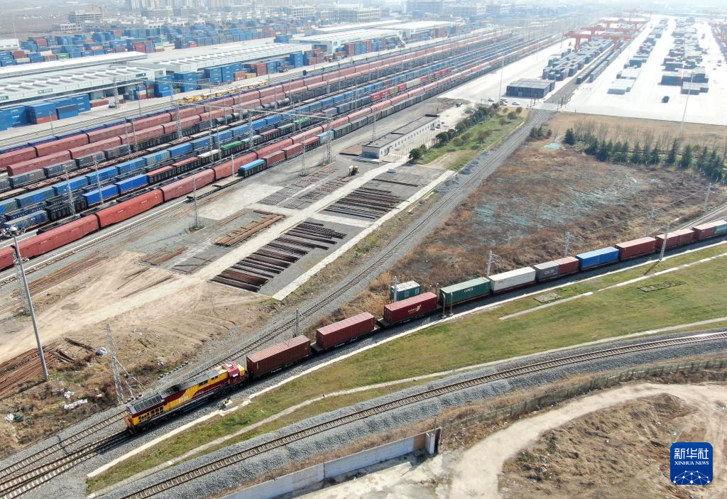 3月21日,满载的中欧班列X8489次从西安国际港务站出发(无人机照片)。 2013年,西安开行首趟中欧班列。目前,中欧班列开行、货运量、重箱运价等重要指标连续多年位居全国第一。目前,位于中欧班列(西安)起点的陕西西安场坝国际港站,已建成铁路运营线路59条,拥有3梁6线的铁路中央集装箱站,年设计吞吐量540万标箱。许多面向欧洲和亚洲的贸易和运输项目已经竣工并投入使用,例如卡扎哈萨克斯坦的西安航站楼正在将其转变为现代化的国际贸易和物流枢纽。新华社记者 李艺博 供图