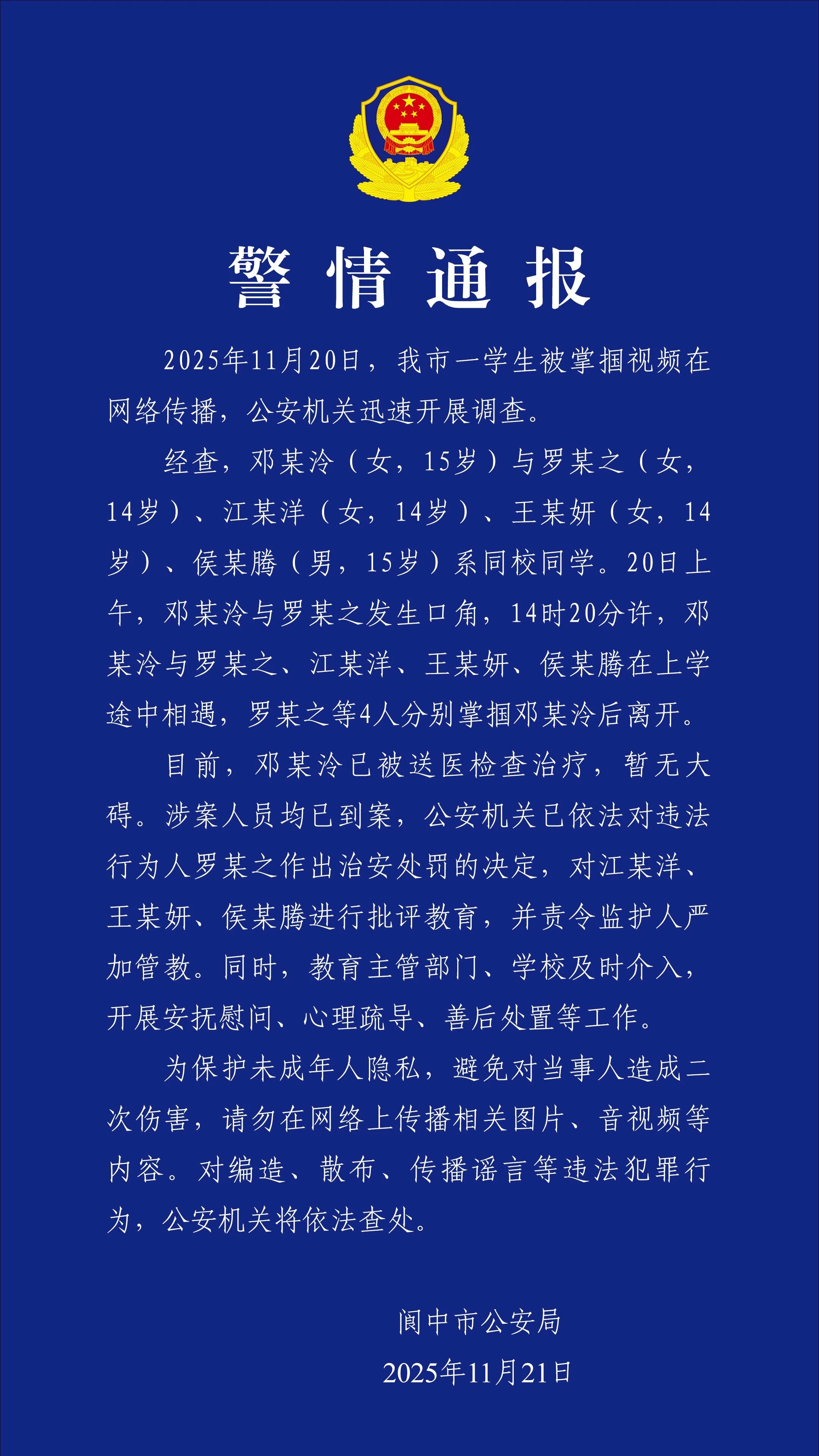 央视新闻:四川省阆中市公安局11月21日发布警方通报。2025年11月20日,我市一名学生被掌掴的视频在网上流传,公安机关立即展开调查。经查,邓木玲(女,15岁)、罗木枝(女,14岁)、姜木阳(女,14岁)、王木艳(女,14岁)、侯木腾(男,15岁)是同一学校的同学。 20日上午,邓木龄与罗牧植发生争执。下午2时20分左右,邓某玲、罗某玲、蒋某阳、王某阳、侯某腾在上学途中相遇。罗牧之等四人拍了邓牧令一巴掌就离开了。目前,邓茂玲已被送往医院检查治疗,据称身体状况良好。所有涉案人员均已抵达事故现场 los organos de seguridad públicadecidieron imponer严刑拷打罪犯罗牧之,对江牧阳、王木彦、侯木腾等人进行批评和教育,对教父们进行严刑拷打。在此期间,我们将进行自动教育和学校干预,以提供布林达咨询、心理咨询和后续教育的机会。请保护您的隐私并避免与各部分关系相关的次要事项,不得在互联网上提供任何图片、音频、视频或其他相关关系。公共安全机构对非法行为和违法行为进行调查、捏造、传播和传播符合法律规定的谣言。