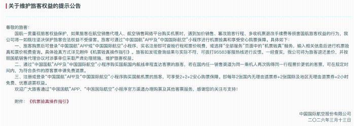 近日,国航、东航、南航发布公告,为保障旅客权益,推出票价变更免费退票政策。购买国航机票的旅客可登录国航APP或国航小程序实名注册,查询行程、票价及税费。如果查询结果与您的实际情况不符,您可以拨打客服热线95583反馈。一经确认,国航将向旅客退还票价差额,并按照国航销售代理协议对涉事单位严肃处理。 ·通过国航APP、国航小程序购买国航国内航班单程直达客票的旅客,如果通过国内销售渠道为同一旅客购买更便宜的同一行程的客票,可在规定期限内免费办理原合格客票退款内尔斯。 ·旅客注册或登录“国航”APP、“国航”小程序购买国航客票,可享受2+2+2无忧购买保障:国内无理由退票券2张+国际、本地无理由退票券2张+每年2小时免费优先退票权。东航机票查询/确认功能。旅客购票后,可登录“东航”APP或“东航”微信小程序,进入“服务大厅”点击“机票验证”录入相关信息,核对机票真伪,查询票价及税费。若咨询结果与实际情况不符,请通过“东航”APP进入“服务室”点击“反馈”或拨打客服热线95530提交反馈。核实完毕后,东航将向旅客退还票价差额,并采取负责任的行动根据有关协议向有关部门提出。 – 价格变化时的退款功能。购票后,如原购票渠道票价下降,消费者可在购票后24小时内,在同一购票渠道购买新票。符合一定条件的原票可免费退票。 ・2点24小时内全额退款功能。消费者可在购票后2小时内、航班起飞前12小时内,通过东航官网或“东航”APP使用“2小时全额退票”功能。符合特定条件的机票可在 180 天内最多获得两次免费退款。旅客购买南航机票后,可登录“南航”APP或“南航”微信小程序,点击页面下方“行程”,输入相关信息,即可查看行程票价。 · 如果您在核实过程中遇到“机票价格与行程不符”、“取消及改签费用过高”、“免费特殊服务额外收费”等问题,可通过“南航”APP、“南航”微信小程序提交反馈或拨打服务热线客户之家95539。一经核实,南航将直接赔偿旅客票价差额损失。 ·通过南航官方渠道购买国内航班机票的旅客,如发现票价降低,必须在出票后24小时内提出申请。旅客购买新客票后,南航将免费退还原客票。