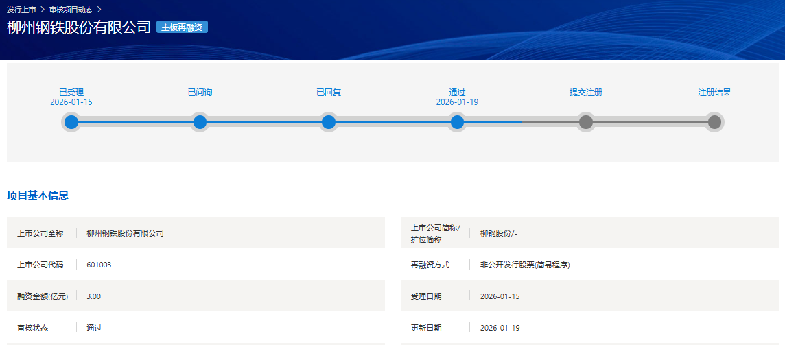 中国经济网北京1月20日电 据上海证券交易所网站消息,柳钢股份有限公司(以下简称“柳钢股份有限公司”,601003.SH)私募股权发行项目已于1月19日获批。1月15日,柳钢股份有限公司宣布计划通过简易程序发行2025年定向股票。招股书显示,本次发行募集资金总额不超过3亿元,不超过3亿元,不超过最近一年年末净资产的20%。扣除发行费用后的募集资金净额将全部投资于以下项目: 平均厚度2800毫米板材优质技术进步及改造项目。本次发行面向特定投资者,不超过35家。发行人为诺德基金管理有限公司、广西桂环第一股权基金合伙企业(有限责任公司)、申万宏源证券有限公司、财通基金管理有限公司、广西产业投资资本管理集团有限公司、陕西庄岭股权投资合伙企业(有限责任公司)、杭州长航资产管理有限公司-长城。 -七星。鲁秀麒麟1号私募证券投资基金、华安证券资产管理有限公司、广东鲁聚交易集团有限公司、青岛鲁秀投资管理有限公司——鲁秀麒麟6号私募证券投资基金,全部发行方式为现金认购。上述各发行人已与公司签订了《有效且有条件的股份认购协议》。本刊物主题与本公司无关。本次向特定对象发行的股票为程序简单发行的人民币普通股(A股),每股面值人民币1.00元。本题采用了一种方法定向发行股票手续简单,发行募集资金将在中国证监会作出登记决定后10个工作日内完成支付。本次发行的价格参考日为2025年12月19日,即公司股票发行期首日。本次发行人的发行价格为4.20元/股。根据本次发行竞价结果,本次发行股份数量为71,428,571股,不超过公司发行前股本的30%。相应收入金额不超过3亿元,且不超过最近一年年末净资产的20%。本次发行对象为诺德基金管理有限公司、广西广西第一股权基金合伙企业(有限合伙)、申万宏源证券有限公司、财通基金管理有限公司、广西产业投资资本歌剧院集团有限公司、陕西创灵股权投资合伙企业(有限合伙)、杭州长航资产管理有限公司、青岛股份有限公司-长城-启航第一私募证券投资基金、华安证券资产管理有限公司、广东乐居交易集团有限公司、青岛鲁秀投资管理有限公司-鲁秀麒麟第六期私募证券投资基金,上述发行人已各自签订了《有条件的私募证券投资基金》。与公司签订的《股份认购协议》。上述发行人在本次发行前后与公司不存在关联关系,本次发行不属于关联交易。本次发行后不再发生新的关联交易。截至2025年9月30日,持有本公司5%以上股份的股东持股情况如下。广西柳钢集团有限公司直接持有本公司股份1,910,963,595股,持股比例为持股74.57%,为公司第一大股东。王文辉先生直接持有公司股份216,447,688股,持股比例8.45%,为公司第二大股东。公司实际管理人为广西壮族自治区国有资产监督管理委员会。本次发行完成后,公司股本将相应增加,公司股权结构将发生变化。由于本次融资规模较小,对初始股东资本比例的稀释作用有限。虽然柳钢集团持股比例将有所下降,但仍将是上市公司第一大股东。上市公司的实际管理人仍为广西壮族自治区国有资产监督管理委员会。我们的管理权不会因以下原因而发生变化:f 这个问题。本期保荐机构为国轩证券股份有限公司,保荐代表人为齐百刚、王琪。