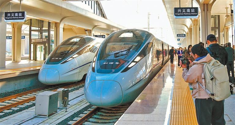 11月28日,G5356次动车组从兴义南站出发,新建的贵州盘州至兴义高铁正式开通。记者 王新伟 供图 11月28日,一列动车组列车在盘新高铁上运行。盘兴高铁的开通,消除了黔西南地区的交通瓶颈,将盘州从交通节点提升为四通八达的区域中心。摄影:曾明(中国经济视野) 兴义南站 11月28日摄 图:刘青(中国经济视野) 11月28日,身着民族服装的乘务员在盘兴高铁首趟列车上为旅客服务。刘朝富供图 11月28日,乘客庆祝开业首趟盘兴高铁开行。盘兴高铁开通后,兴义至贵阳只需两个小时。刘庆供图(中国经济视野) 盘兴铁路纳淮河大桥施工现场。盘兴高铁沿线山高谷深,施工难度极大(2022年5月26日摄)。刘朝富供图 11月28日,新建的贵州至盘州兴义高铁(以下简称“盘兴高铁”)正式开通。至此,贵州省成为西南地区首个在市(州)中心城市实现大规模开行高铁的城市,正式形成省会贵阳至省内8个市(州)中心城市的1至2小时高铁交通圈。盘兴高铁线路起点为贵州省盘州市六盘水镇盘州站,终点为黔西南州扶余苗族自治州兴义镇兴义南站。主线全长约99公里,共有桥梁46座、隧道38座。桥梁和隧道总长89.19公里,约占线路总长度的91%。是贵州省桥梁、隧道比例最大的高速铁路。高铁建设难度大,需要穿越喀斯特山区,地质条件极为复杂。承包商以科技为先导,采用创新工艺施工方法,成功应对岩溶、瓦斯、断裂带等诸多挑战,培养专业人才。保障了项目顺利推进,为我国高水平铁路建设积累了宝贵经验。我国地质环境复杂。随着盘兴高铁的开通,黔西南县综合立体交通体系中的重要一环建成。高铁将连接马岭峡、万峰森林、乌蒙草原等众多优质旅游资源,开通前往黄果树、紫金洞等著名景区的高速通道,形成高效旅游线路,加快“交通+旅游”融合发展。特色农业、大健康产业、新兴工业化、旅游业。列车高速翻越千山,开辟了黔西南通往外界的新航道,仁济为贵州高质量发展注入新活力。 (经济日报记者 王新伟 吴秉泽)
